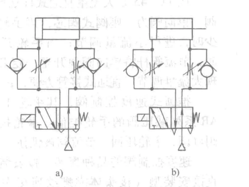 · Kohdassa (a) (pakokaasun kuristus), kun suuntaventtiili saa jännitteen, sylinterin tulopuolen takaiskuventtiili avautuu, jolloin sauvaton puoli täyttyy nopeasti. Tangon puolelta ilma pääsee poistumaan vain kaasuventtiilin kautta. Säätämällä kaasuläpän aukkoa voidaan säätää sylinterin nopeutta. Tämä menetelmä tarjoaa vakaan männän liikkeen ja on yleisimmin käytetty piiri.