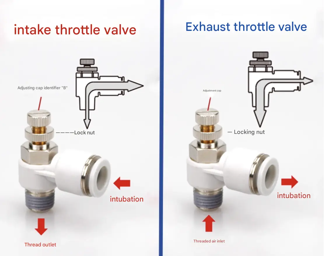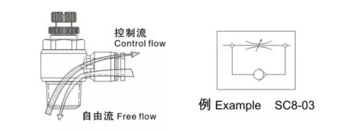 Toiminnallisista symboleista voimme nähdä, että sekä pako- että tulovirtauksen säätöventtiilit ovat yksisuuntaisia kuristusventtiilejä, jotka ohjaavat virtausta vain yhteen suuntaan ja sallivat ilmavirran vapaan kulkemisen. Kaksitoimisissa sylintereissä pakokaasuventtiilit ovat suositeltavia parantamaan sylinterin liikkeen vakautta. Yksitoimisissa sylintereissä, joissa käytetään yleensä jousta ulos- tai sisäänvetoon, kun ilmaa ei ole, kaasun on voitettava jousivoima käytön aikana, joten imukaasuventtiilit sopivat nopeuden säätämiseen.