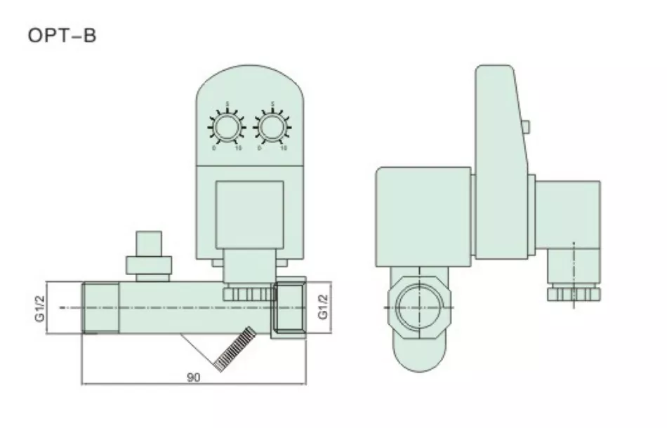 OLK OPT-B Electronic Timer Auto Drain tukee sekä sähköistä ohjausta että manuaalista sammutusta kaksoissuojana; ulkoinen manuaalinen sulkukytkin on varattu venttiilin runkoon estämään virtaus sähkökatkon aikana. Sisääntulo sijaitsee kelasta poispäin olevalla puolella, keskimmäinen ilman kierteitä on tyhjennysaukko ja viimeinen portti on poistoaukko.