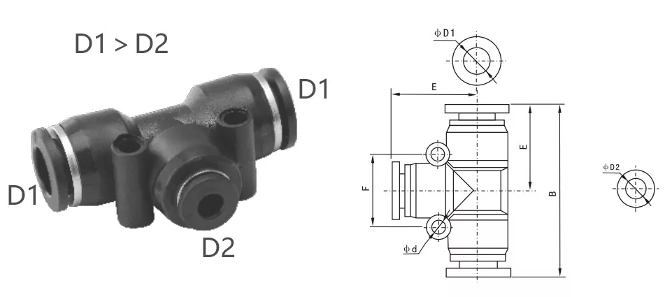 PE -sovitus (tasa -arvoyhdistys): Kaikilla kolmella putkella on sama ulompi halkaisija, joka sopii kolmen samankokoisen pneumaattisen putken kytkemiseen.